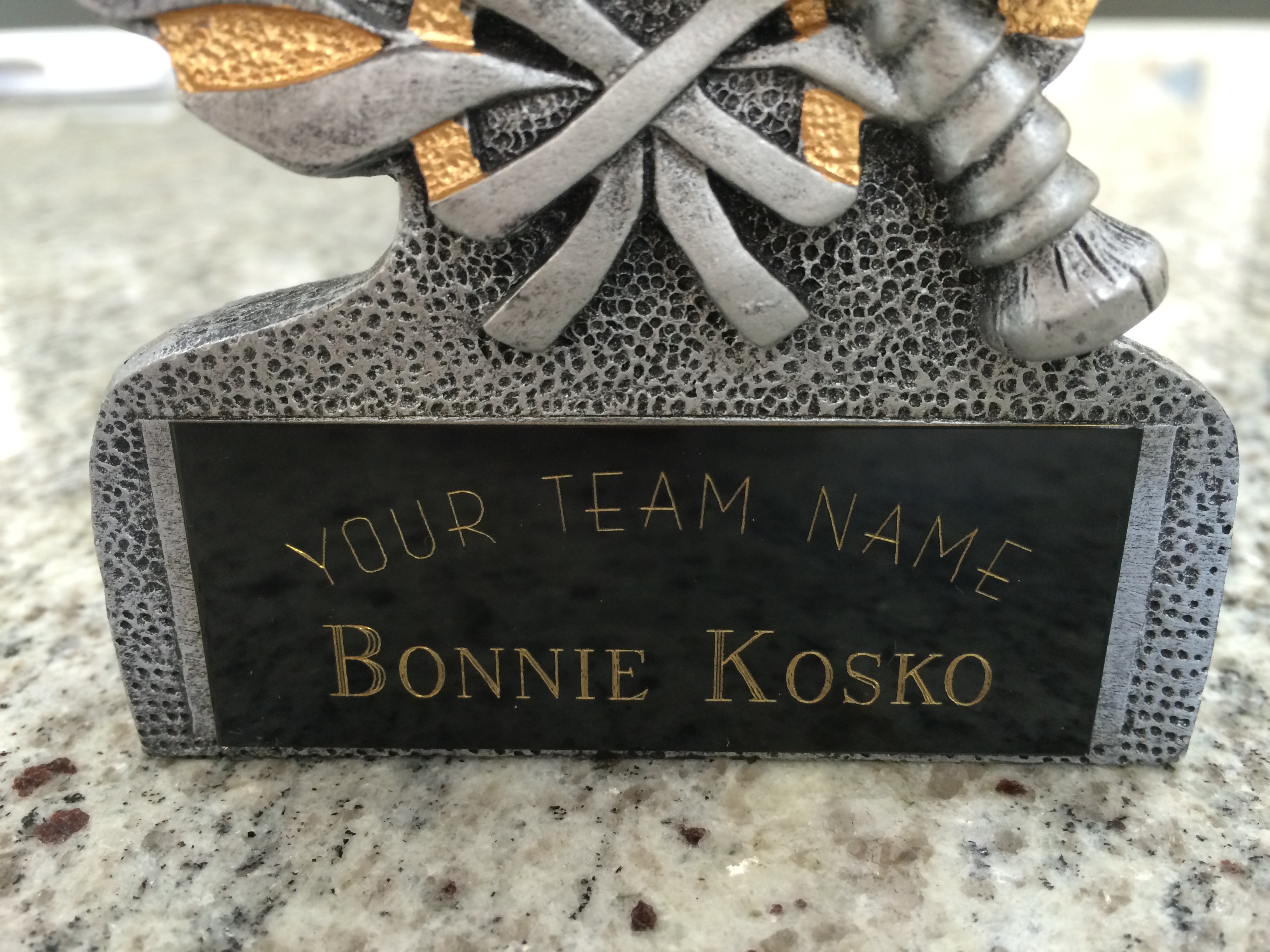 Three different engraving layouts on our 3 common metal plate colors - gold with gold letters, black with gold letters, and black with silver letters.1. Engraving is free. First and most important, engraving is included in the price of your trophy. You can put as few or as many characters of text as you want and it’s still free. Some teams even add a logo.